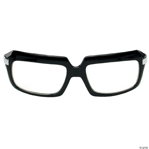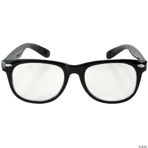 Perfect for 80's fashions! Thick rimmed plastic frames with polished silver metal earpieces and clear plastic lenses.One size fits ages 12 and up.