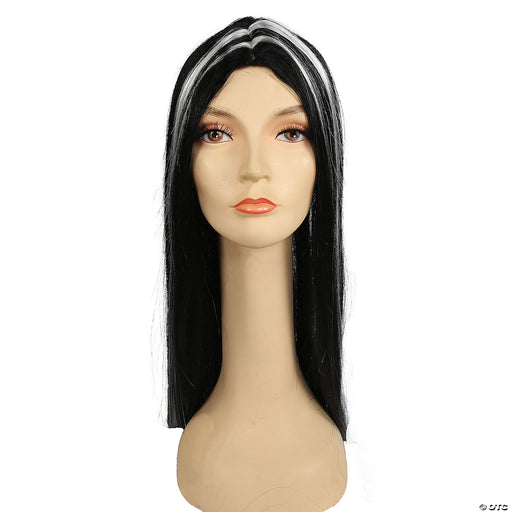 Lacey WigsYou'll love this gothic Vampirette look! Includes: Black synthetic wig with white streaks. One size fits most adults.
