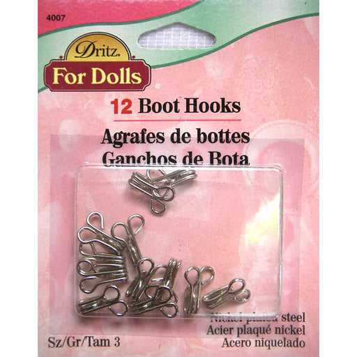 12 pieces per package. Size 3, Nickel-plated steel hooks used to secure laces on miniature shoes.