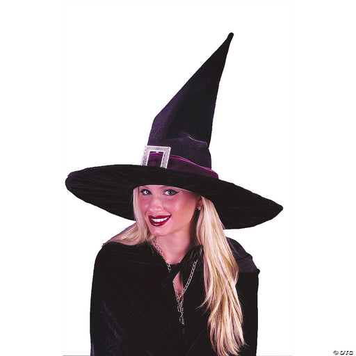 Fun WorldPleated velour witch hat. Measures 17 inches high and 19 inches in diameter with silver buckle hat band. One size fits most