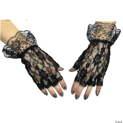 Complete your costume with these gloves Black nylon lace fingerless wrist length gloves. One size fits most women.