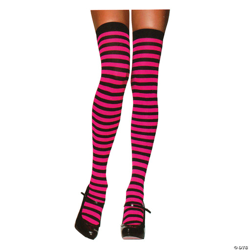 Black opaque nylon thigh high stockings with horizontal opaque stripes. One size fits most.