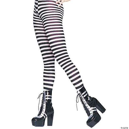 Black opaque nylon thigh high stockings with horizontal opaque stripes. One size fits most.