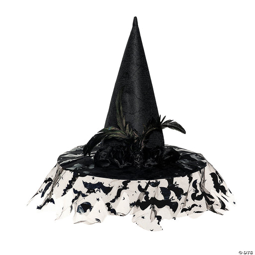 UnderwrapsOur Deluxe Witch Hat is made of a satiny black fabric and covered with a spiderweb lace print. Lovely flower and feathers trim the band and an eleg...