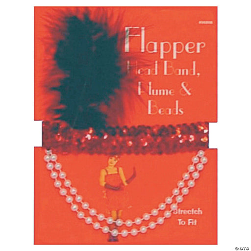 Elastic sequin headband with feather attached. Includes 20's style strand of pearls.