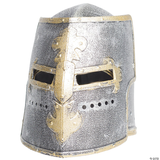 UnderwrapsGreat medieval era silver-colored helmet has golden design and trim. Eye-slits allow for good vision. One size fits most.