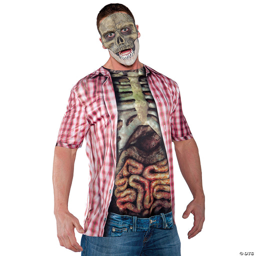 UnderwrapsReveal your skeleton! Plaid collared shirt opened to reveal a person's skeleton. Back of T-shirt shows plaid shirt look. Mask and jeans not included.