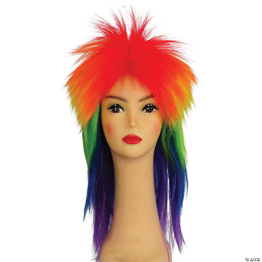 The colorful layers of a rocking attitude! Multi-colored synthetic fiber wig fits most adults.