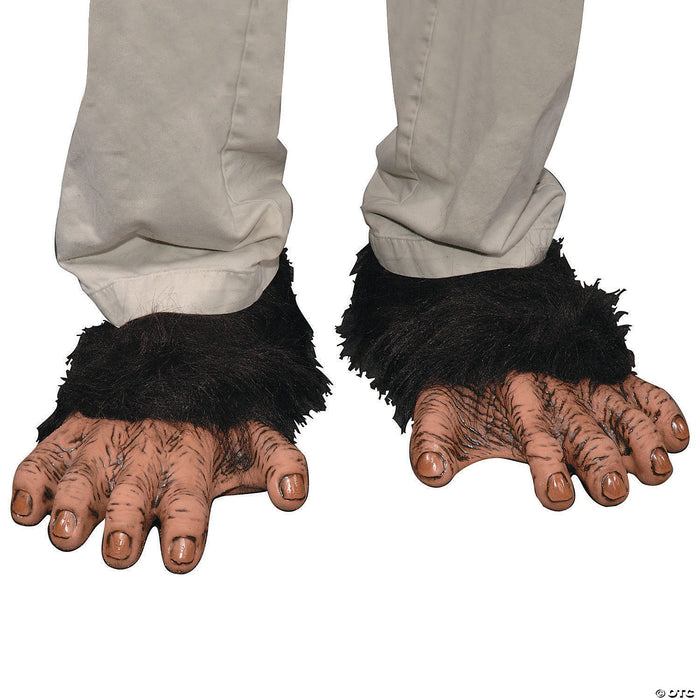 A must-have for your costume, these Chimp Feet are the perfect way to make your character come alive. Black fur with brown latex toes. These shoe covers have elastic bands on the bottom to hold them in place. One size fits most adults.