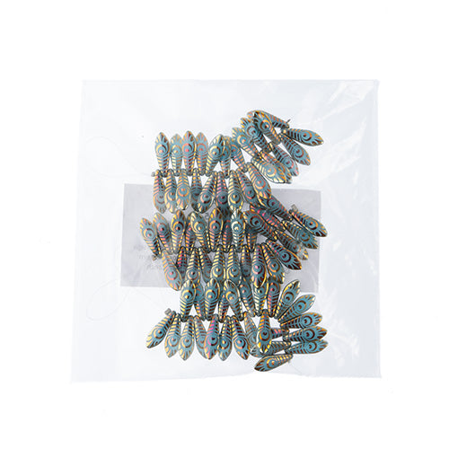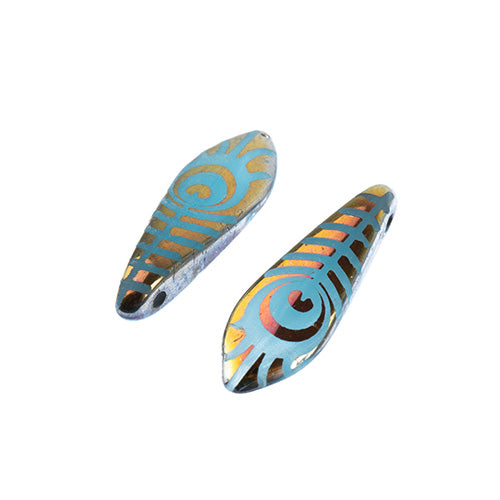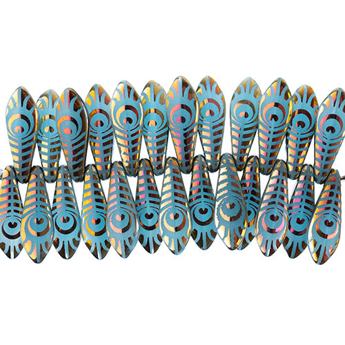 Czech Glass Dagger Bead Strand Laser Etched Design 4in 25pc 5x16mm Gold AB/Blue Peacock Pattern