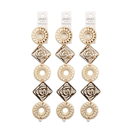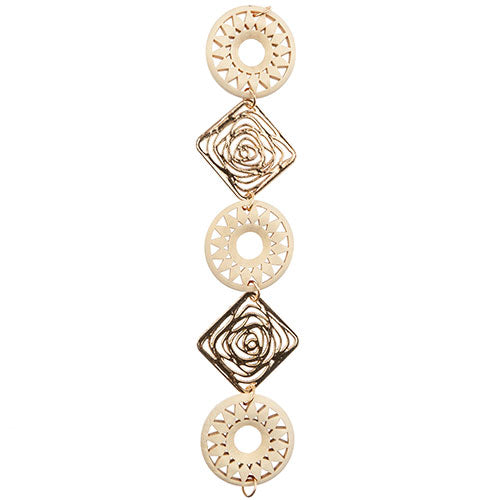 Wood Sun Bead with Metal Gold Square with Rose 7in strand