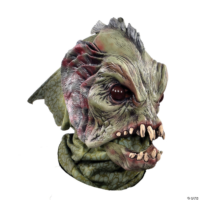 This classic sea creature has a latex front on a green print polyester head sock. The moving mouth and back head extension are great added features. The hidden eye openings provide visibility that is slightly limited. Hand poured, painted and assembled in the US.