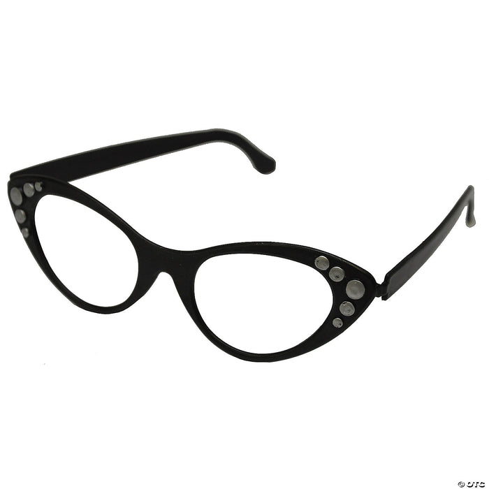 Black plastic cat's eye frames with acrylic rhinestones. No lenses.