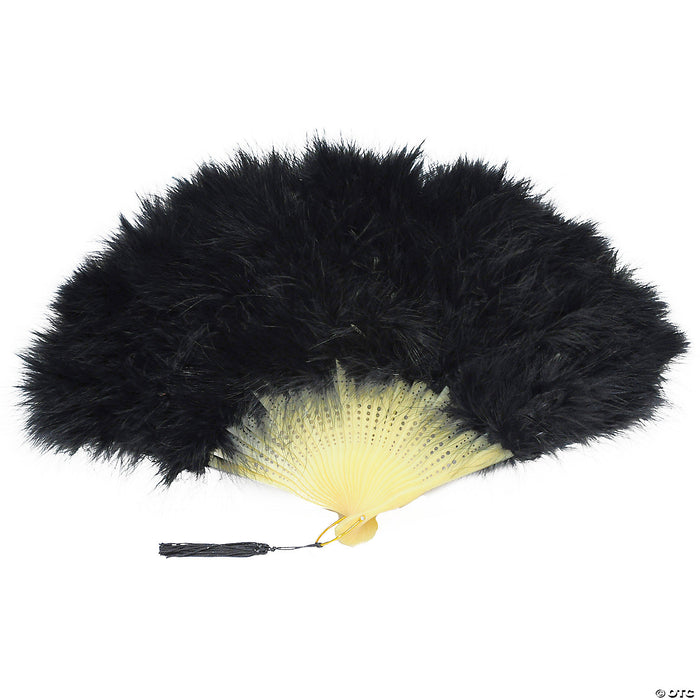 Twelve inch wide fan with marabou plumes on a plastic base. Black.