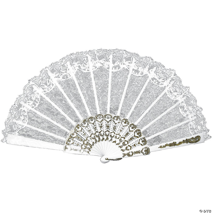 Nine inch fan with intricate lace work on a quality plastic base with gold decorative design.