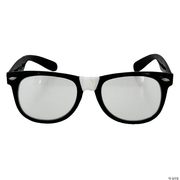 Complete your Nerd look with these glasses! Heavy black frames with some first-aid tape around the nose piece. Great fifties look! Plastic frames and hinges. One size fit ages 12 and up.