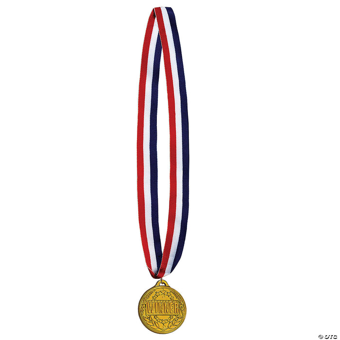 Great for sport themed parties and events! Includes: One winner ribbon with medal. Measures 30" long with a 2 medal on the red, white and blue ribbon.