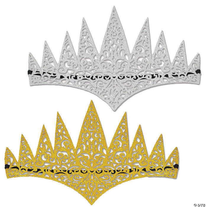 Perfect for a princess party! Glittery lightweight thin foam tiaras have a black 1/4" elastic band for a one size fit. And you get a silver tiara and a gold tiara in each package! Elegant cut-out design is perfect for many historical periods and royalties. Good also for fairytale royalty! 2 tiaras in each package.