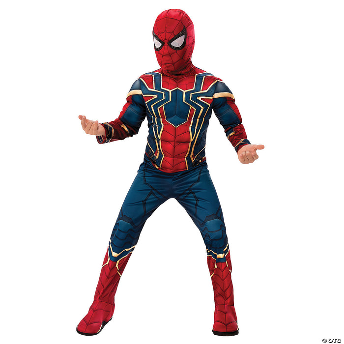 Child's Deluxe Infinity War Iron Spider padded costume jumpsuit with boot-tops and headpiece. Your child will love this costume as it will look like he stepped off the movie screen!