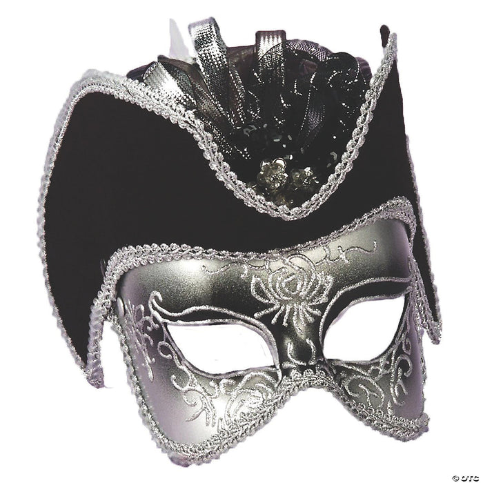 Conjure an eye-catching carnival look at your Halloween festivities with this Silver Venetian Mask. This elegant yet mysterious mask will tie your Venetian Halloween costume together for an exceptionally alluring look! This stunning silver plastic mask includes a black hat attached. Imported.