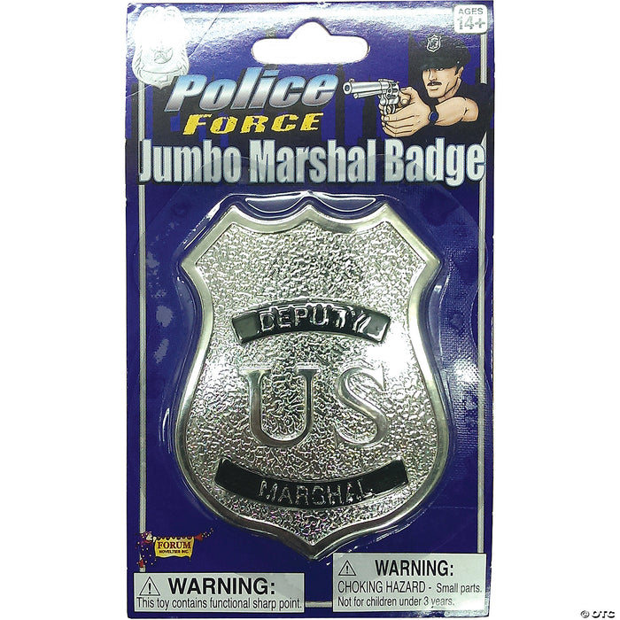Swear to serve and protect! Metal Deputy US Marshal badge has a nice solid weight to them for an authentic feel. 3" tall. Features large embossed U.S. lettering and black bands with the words deputy marshal printed on them. Ages 14+.