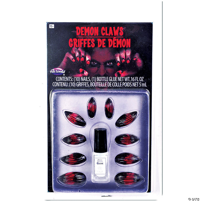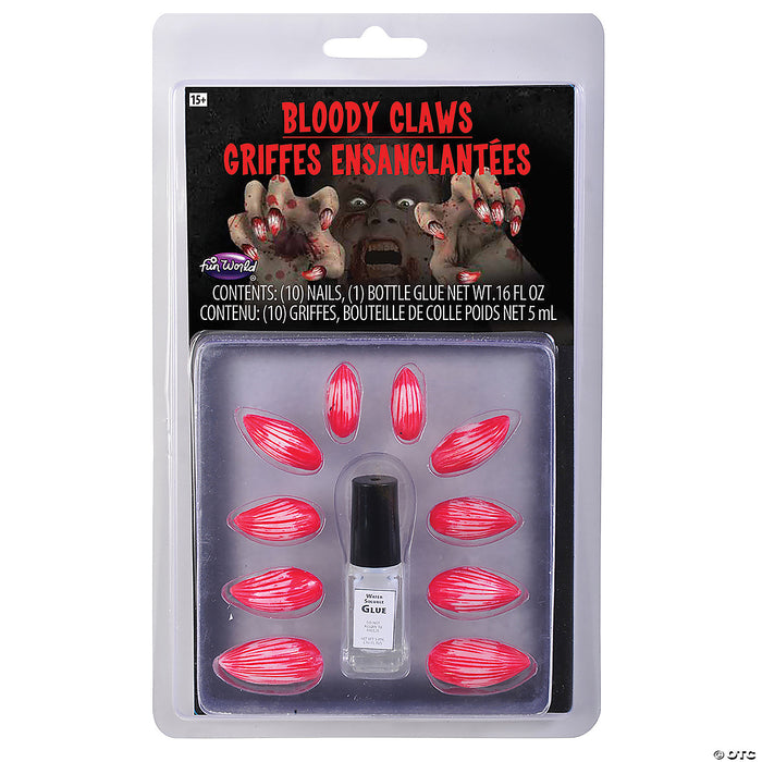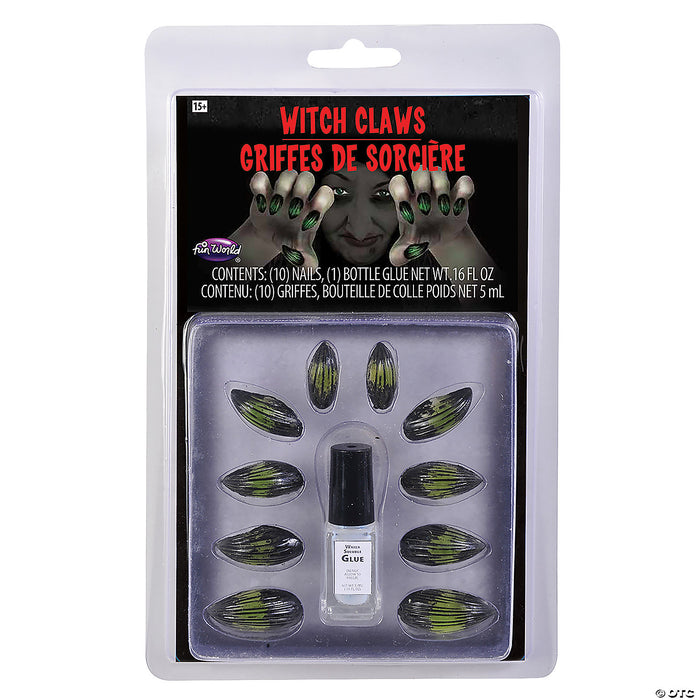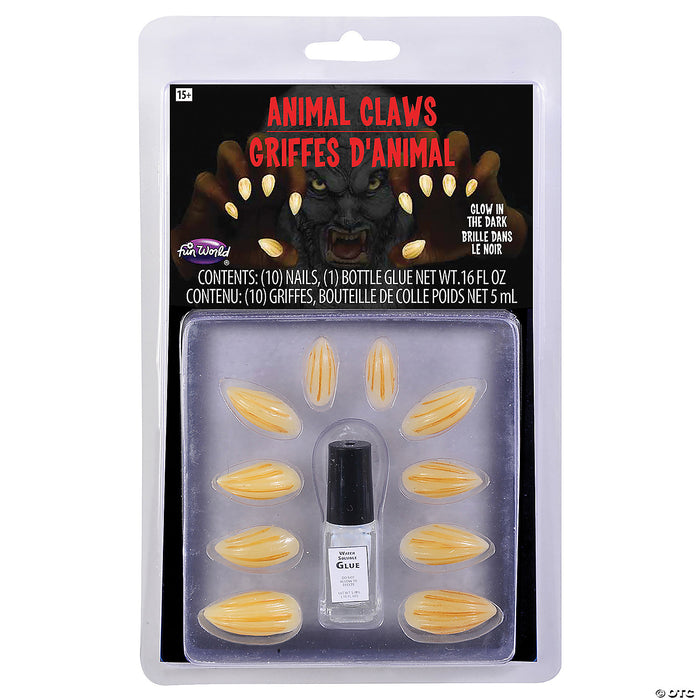 Fun finishing touch to your Halloween ensembles! Glue-on Claws Kit comes with 10 false nails and a 0.16 oz. bottle of water-soluble glue.