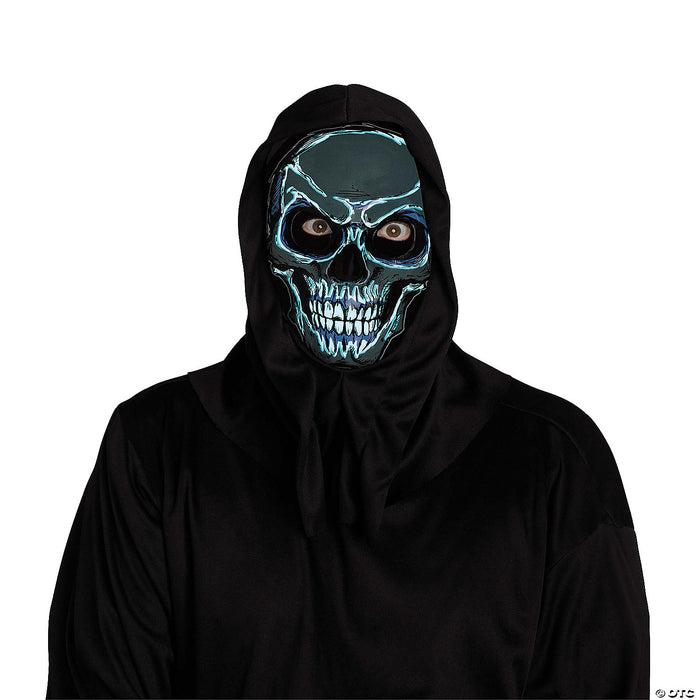 Electro Skull Reaper mask has a unique light-up feature! The silvery face mask has a striking neon blue skull outline light effect which blinks at several different speeds. Requires 2 AA batteries, not included. One size fits most adults.