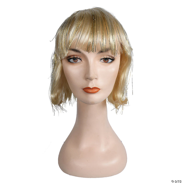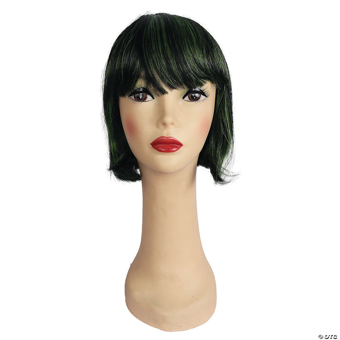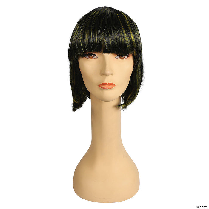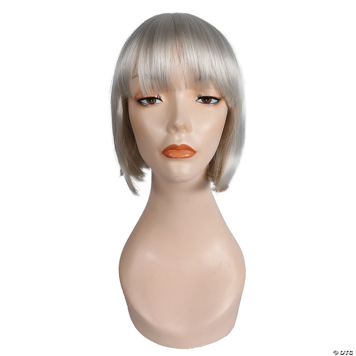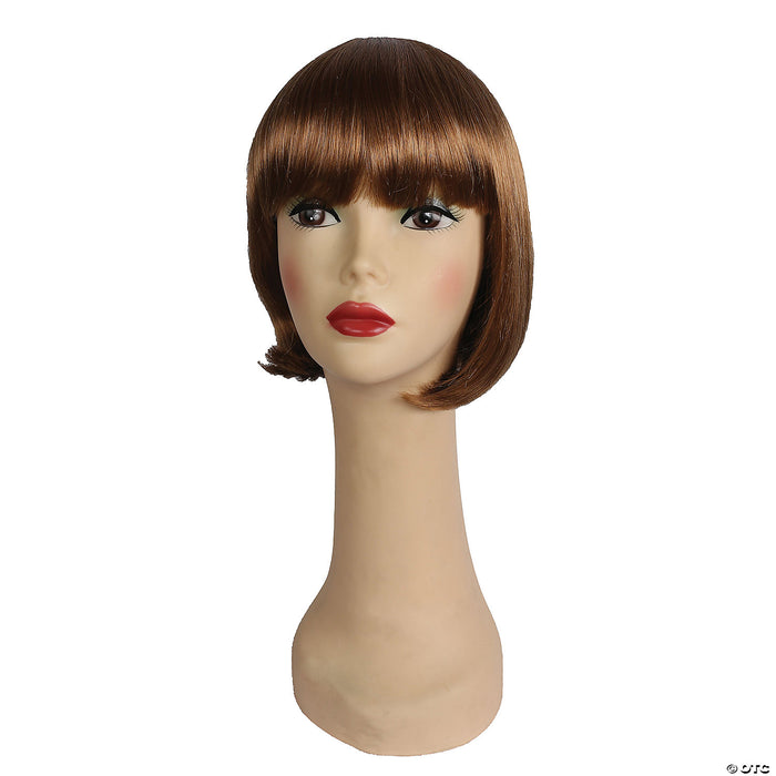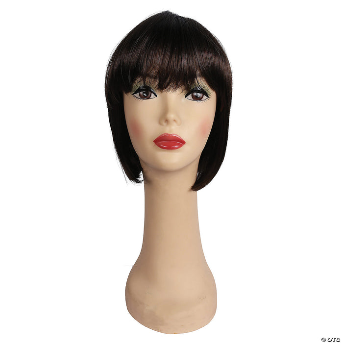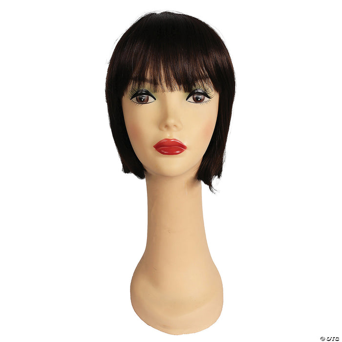 Straight chin length style with bangs. Synthetic wig fits most adults.