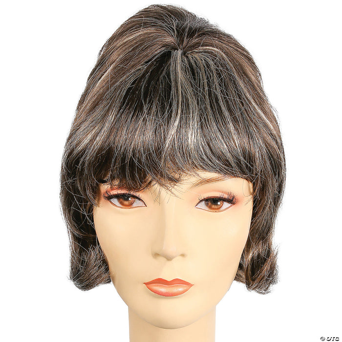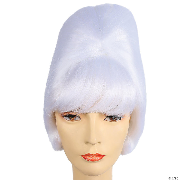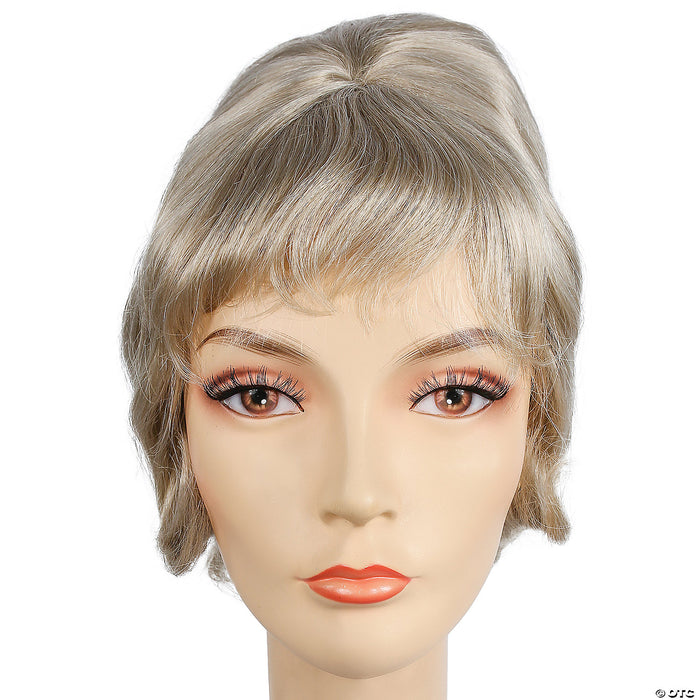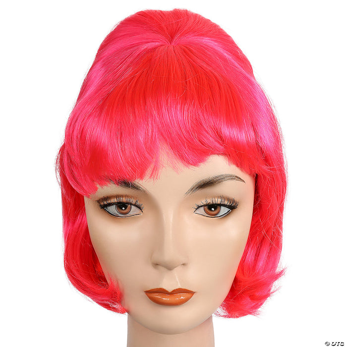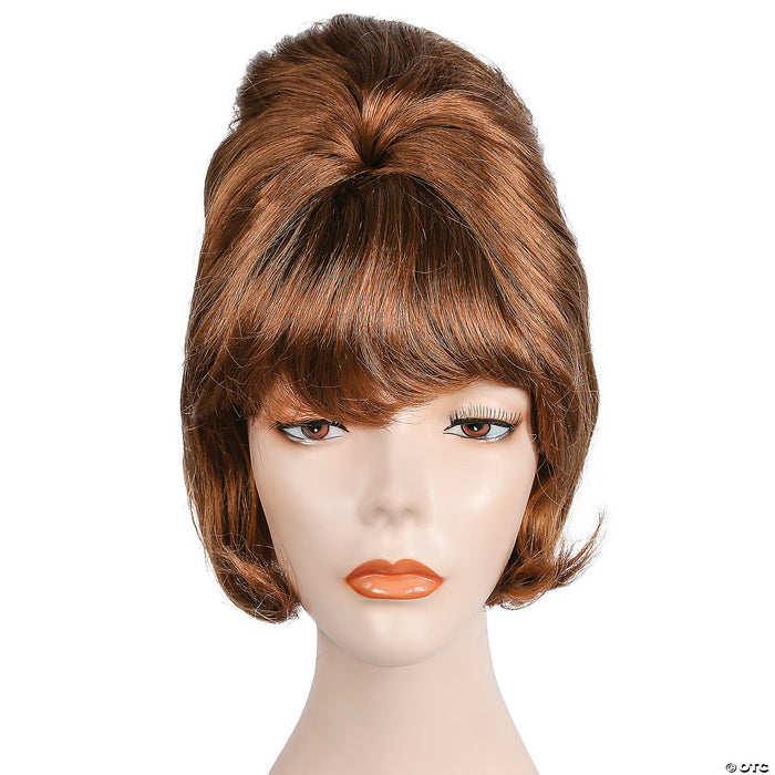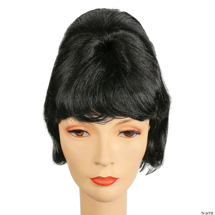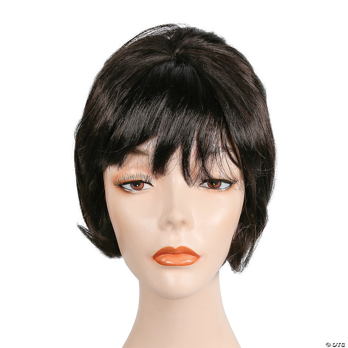 Here's the tall teased-crown 1960's look with the turned-under chin-length style with bangs and that cute spit curl on each side! Synthetic wig fits most adults.