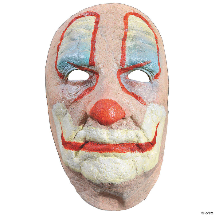 Full face latex mask depicting an elderly clown with fading face paint. One size fits most adults.
