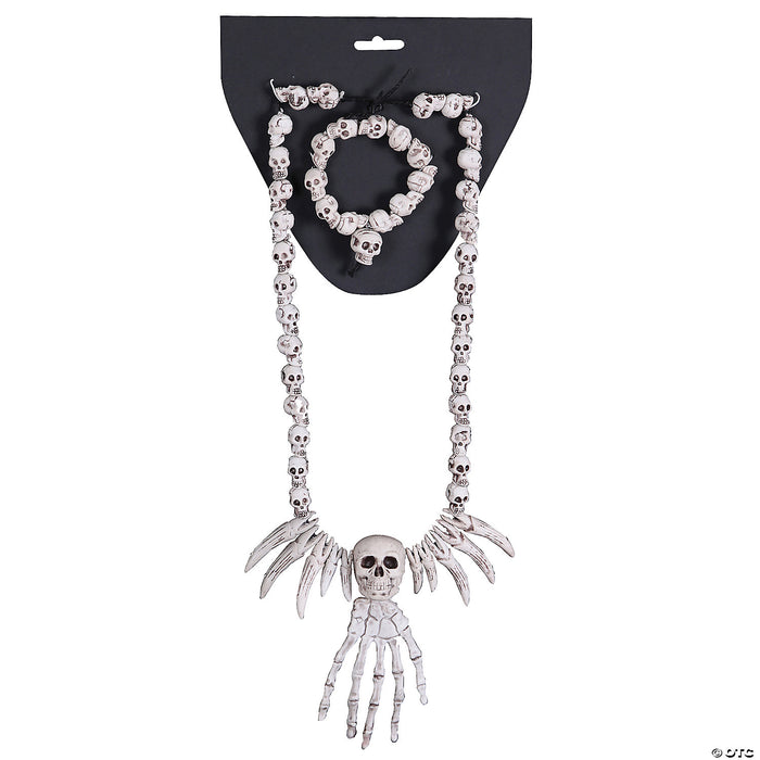 Complete your witch doctor, shaman or zombie costume with these skeletal remains! Includes: Skull head bracelet and skull necklace set. Measures 18.1".