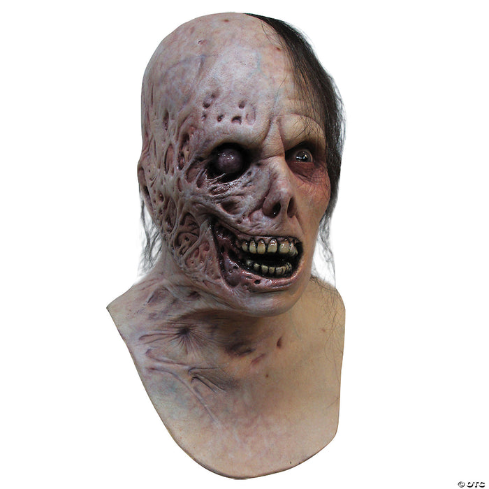 Human-style mask with one side of the face burnt and scarred. Wispy disheveled hair is attached on the other side, and the good eye has an angry fearful look! Full over-the-head latex mask is individually hand-painted for the most realistic look possible. Add your own ragged clothing for a truly scary look! One size fits most.