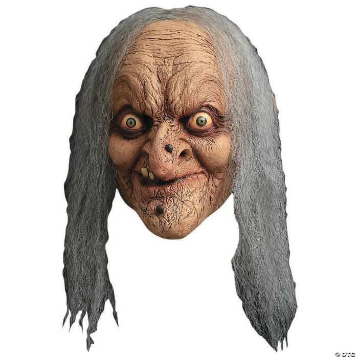 Old woman with haunted gaze creates a very scary Halloween costume. Withered and wrinkled skin, a hooked nose and dark warts make a perfect face for a witch, a demented gypsy or an annoying old hag. Full over-the-head latex mask has untamed grey hair. One size fits most.