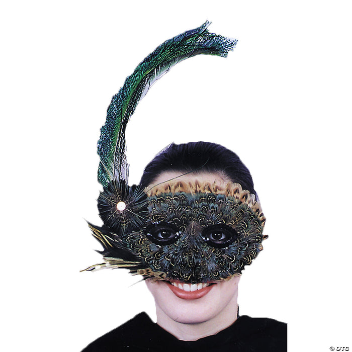 A Fun Party Look! Feather half mask with peacock feathers. Black sequin trim around eyes. One size fits most adults.