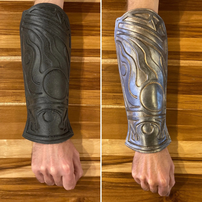 Worbla's Black Art is a non-toxic sheet plastic, black in color with a texture similar to fine grit sandpaper or leather. Black Art can take complex curves without requiring a vacuform or subtractive editing and is self adhesive when activated.